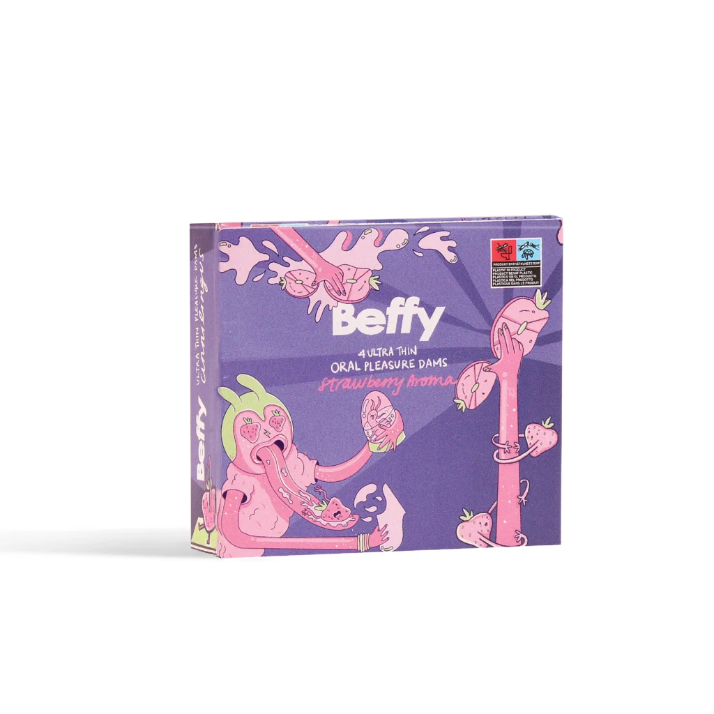 Beffy lick wipes are specially designed for safe oral stimulation of the vagina and anus. They are available in a neutral variant without scent or flavor, and in variants with strawberry or vanilla flavor. The wipes are individually packaged, intended for single use, and available in a box of either two or four pieces.